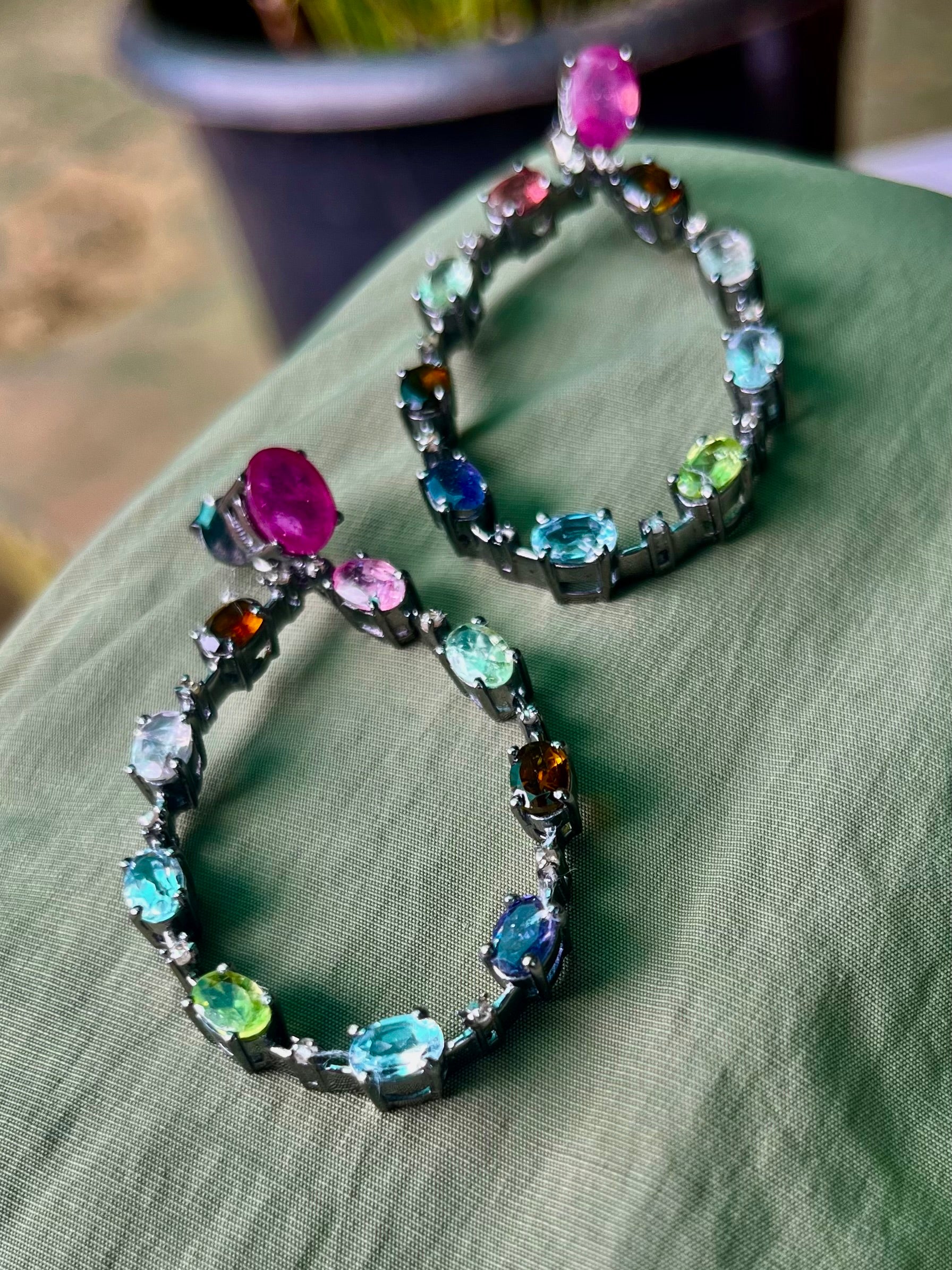 silver earrings adorned with gemstones: