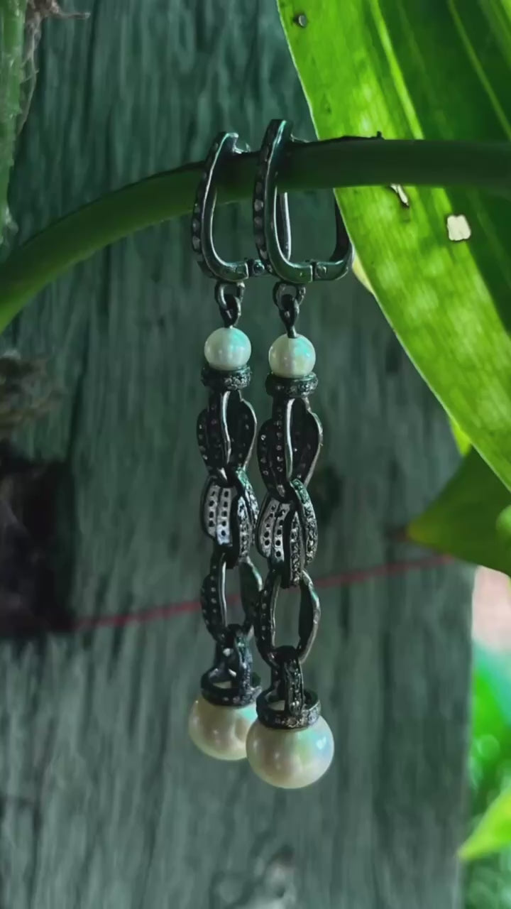 Elegant Pearl Diamond Earrings in Silver with Black Rhodium - Handmade